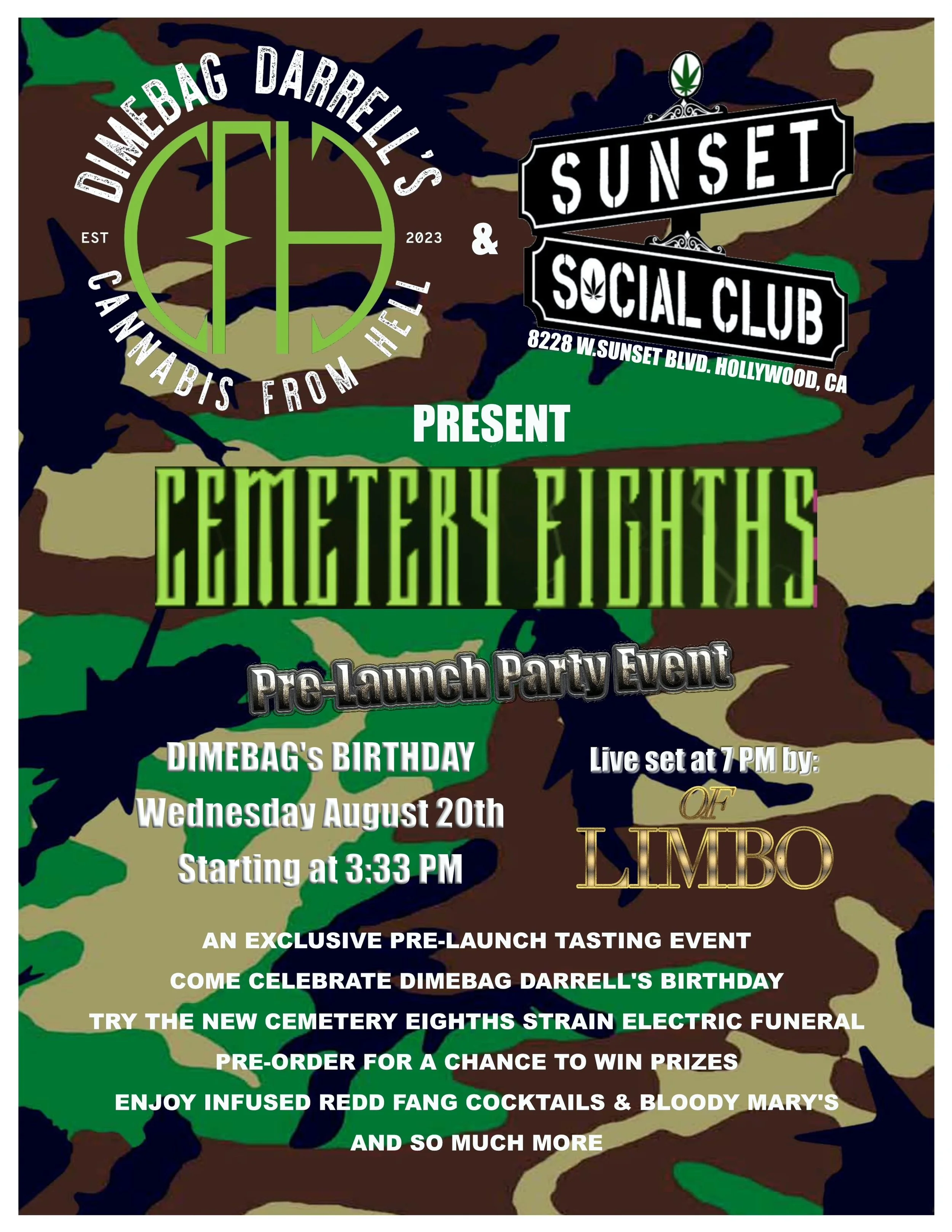 Join us this Wednesday Aug 20th @sunsetsocialclubla for a @dimebagdarrell birthday celebration and enjoy an exclusive tasting from the all new Cemetery Eighths collection brought to you by